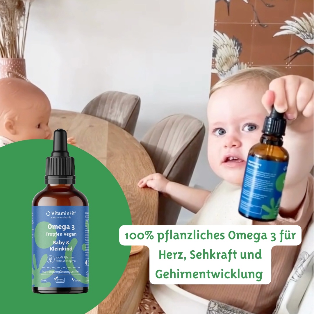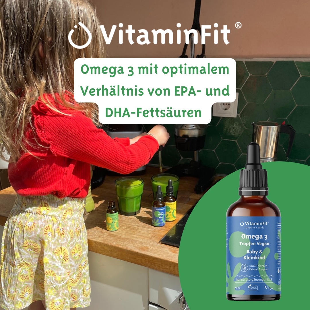 - Kinder im Alter von 2 bis 3 Jahren: 250 mg DHA + EPA insgesamt (20 Tropfen VitaminFit Omega 3 Baby Tropfen oder siehe unser Omega 3 für Kinder)