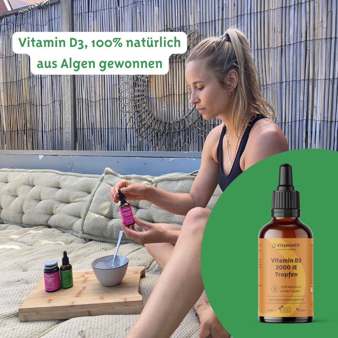 VitaminFit Vitamin D3 Tropfen sind ein 100% pflanzliches und veganes Nahrungsergänzungsmittel auf Basis von kaltgepresstem Öl und hoch absorbierbarem D3 (Cholecalciferol) aus Algen.