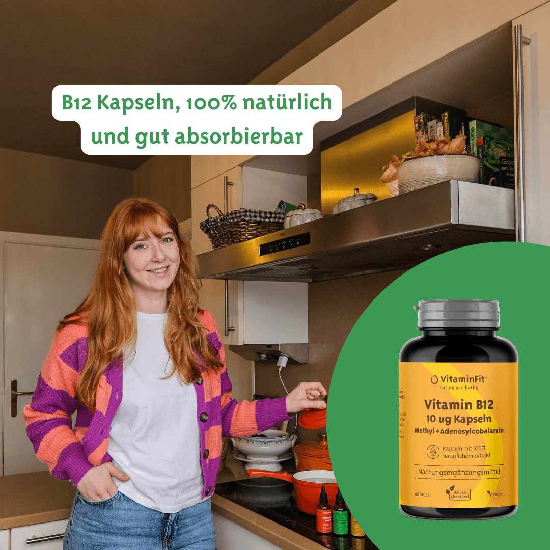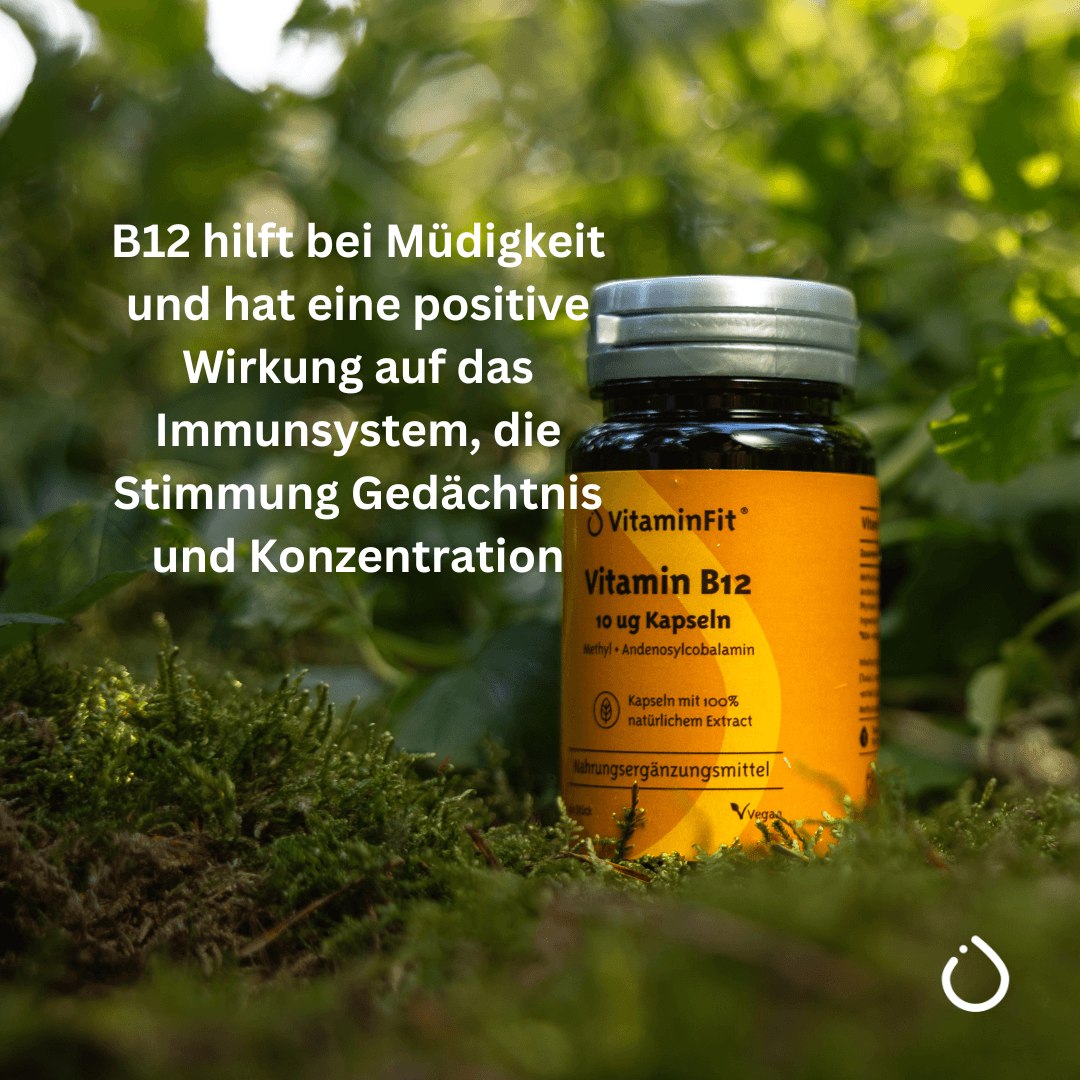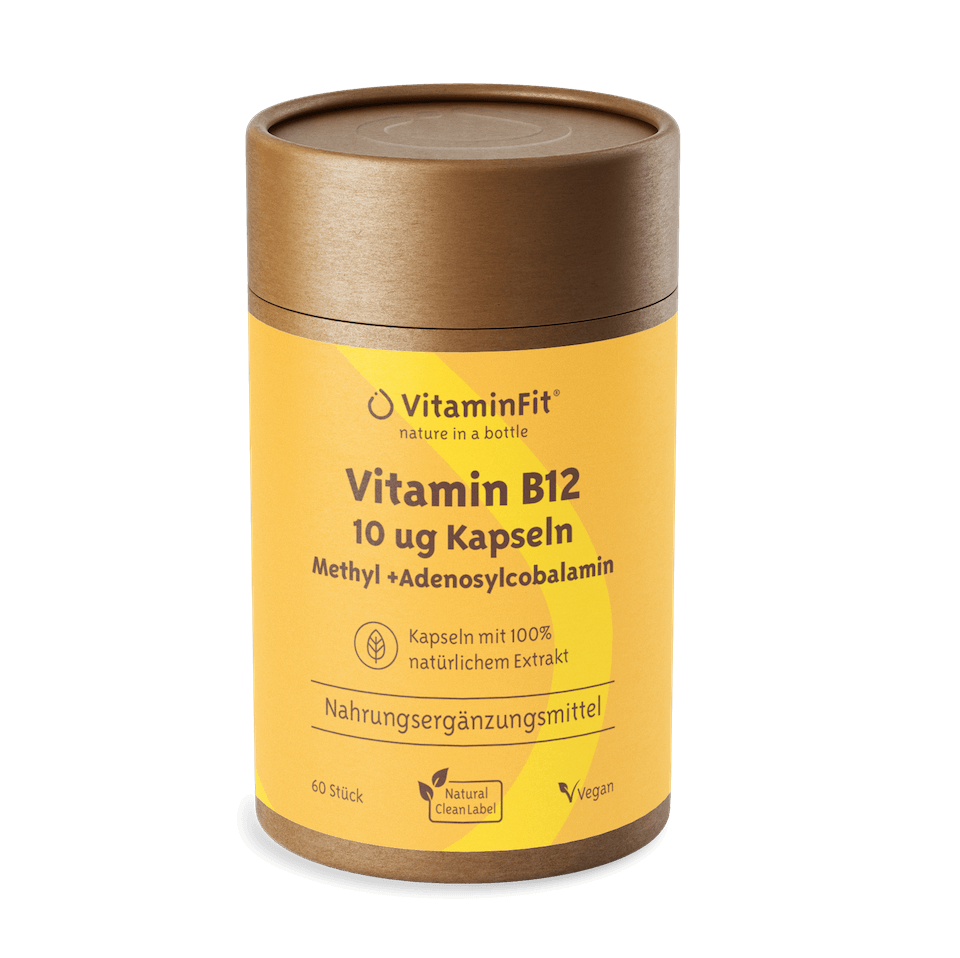 Die Vitamin B12 Kapseln von VitaminFit enthalten die biologisch aktiven Formen Methylcobalamin und Adenosylcobalamin. Der Vorteil der biologisch aktiven Form gegenüber anderen Formen, wie etwa der synthetischen Form Cyanocobalamin, besteht darin, dass das Vitamin B12 nach der Einnahme dem Körper sofort zur Verfügung steht.