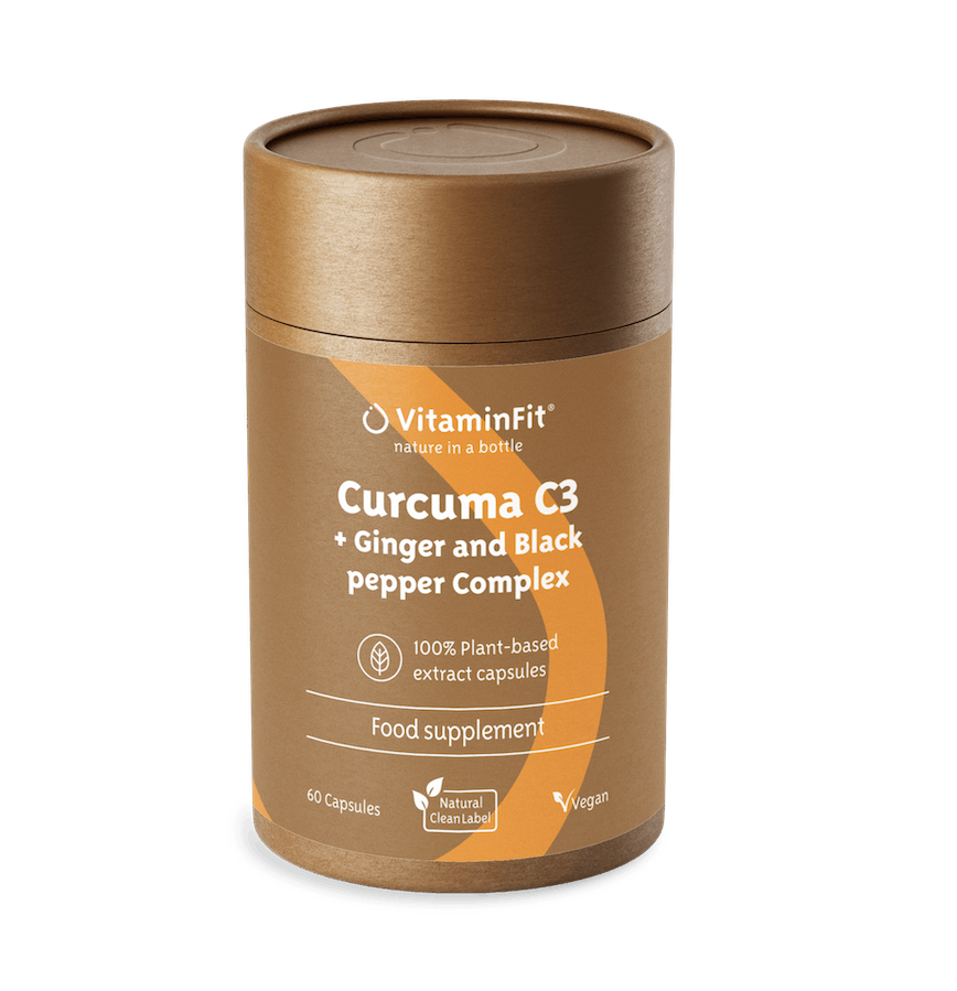 VitaminFit's Curcuma supplement contains the high-quality turmeric extract Curcumin C3 Complex®. This extract is one of the most widely used and extensively researched forms of curcumin in scientific research. The formula also contains ginger and black pepper extract, with a very high piperine content (95%). The combination of curcumin from turmeric, ginger extract and black pepper creates a powerful synergy in which ginger and pepper significantly enhance the absorption and effect of curcumin.