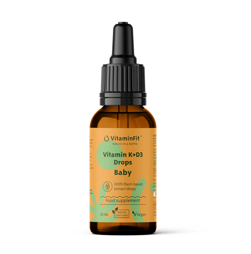VitaminFit's Vitamin K + D3 Baby Drops have been specially developed for babies. They contain a pure, 100% plant-based combination of vitamins K1 and D3 (cholecalciferol from algae) in one handy bottle - without artificial additives, alcohol or preservatives.
