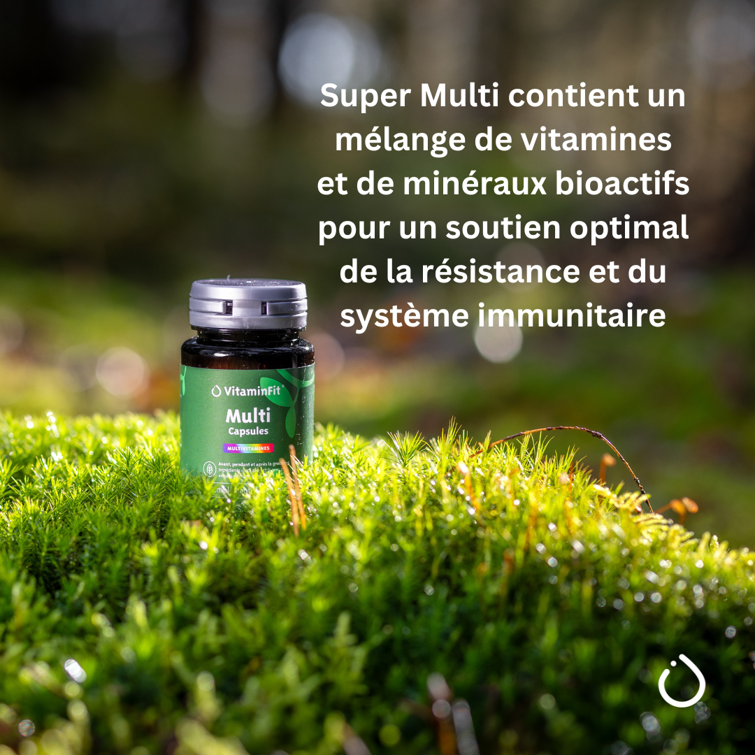 Les aliments fournissent des nutriments importants (vitamines et minéraux). Chaque jour, il est recommandé de consommer au moins 2 portions de fruits et 300 grammes de légumes. Si nous ne parvenons pas à obtenir suffisamment de ces nutriments essentiels au quotidien, une multivitamine peut compléter notre alimentation pour plus d'énergie, une meilleure forme et une bonne résistance.