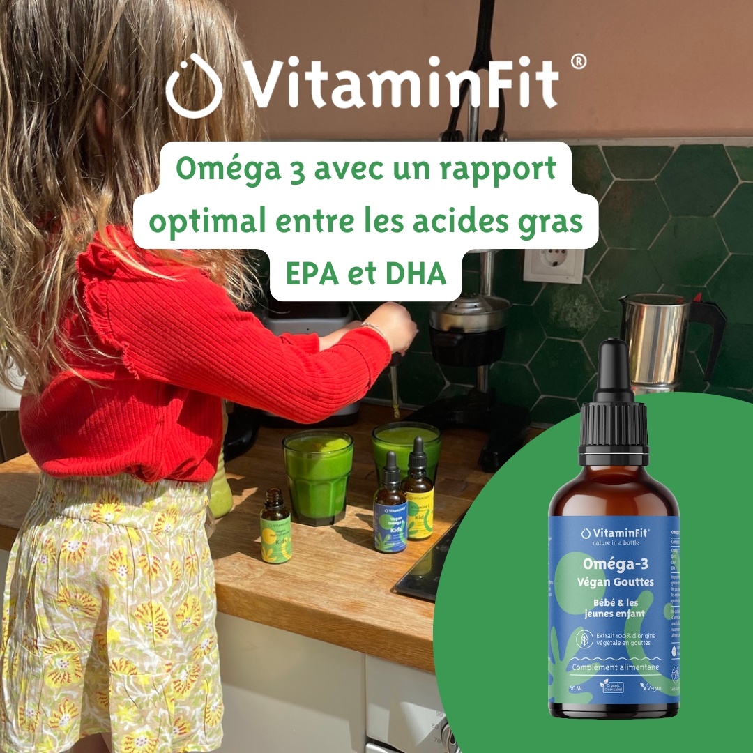 - Enfants de 2 à 3 ans : 250 mg de DHA + EPA au total (20 gouttes de VitaminFit Omega 3 Baby Gouttes ou voir nos oméga 3 pour enfants).