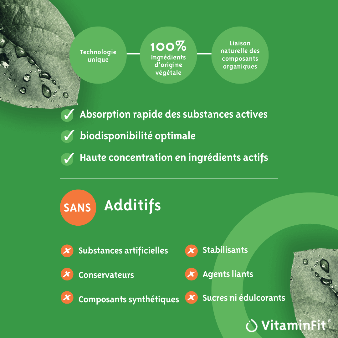Les compléments alimentaires ne peuvent se substituer à une alimentation équilibrée et à un mode de vie sain, qui déterminent notre qualité de vie. Tenir hors de portée des enfants et conserver à l'abri de la lumière. Ne dépassez pas l'apport journalier recommandé. Consultez un spécialiste avant de prendre des compléments alimentaires en cas de grossesse, d'allaitement, de prise de médicaments et de maladie. Complément alimentaire.