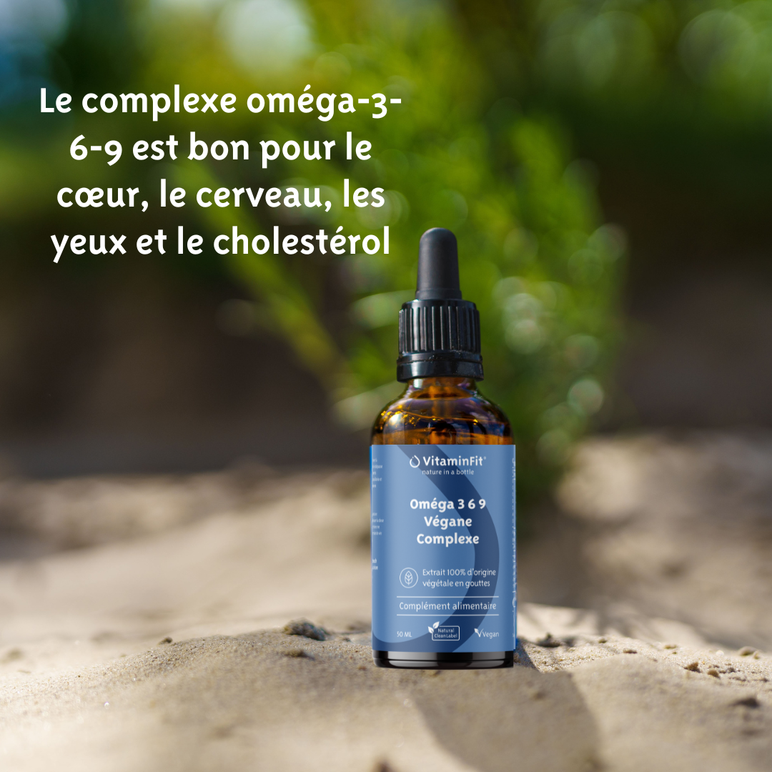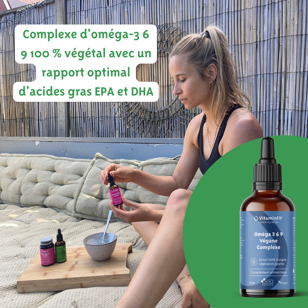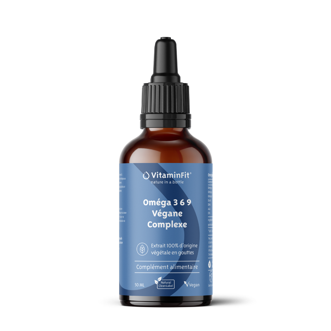 VitaminFit Omega 3-6-9 complex est une formule liquide et végétale contenant les acides gras insaturés essentiels (ALA) acide alpha-linolénique, (EPA) acide eicosapentaénoïque et (DHA) acide docosahexaénoïque. Essentiel signifie que le corps ne peut pas produire ces acides gras insaturés, mais en a besoin. Selon le régime alimentaire, avec ou sans consommation de poisson, un complément peut être nécessaire sous forme de supplément.