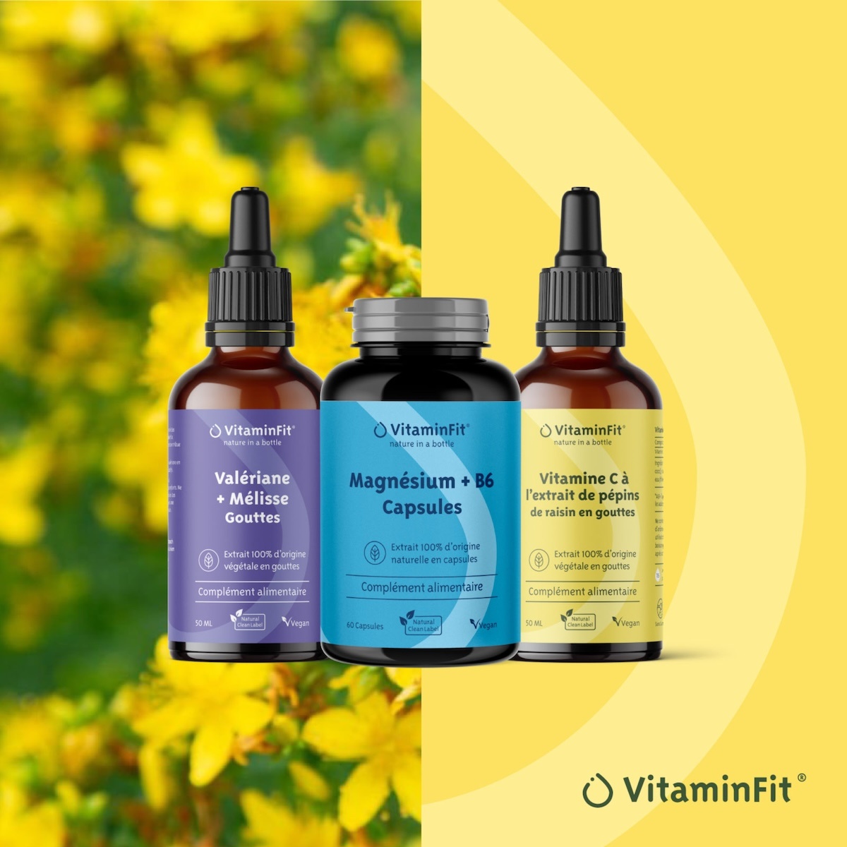 La combinaison de gouttes de valériane et de mélisse, de magnésium + B6 et de vitamine C avec de l'extrait de pépins de raisin soutient le système nerveux, favorise la relaxation et aide à lutter contre la fatigue, le stress et à passer une bonne nuit. Cette synergie apporte une tranquillité physique et mentale, surtout pendant les périodes de stress intense.