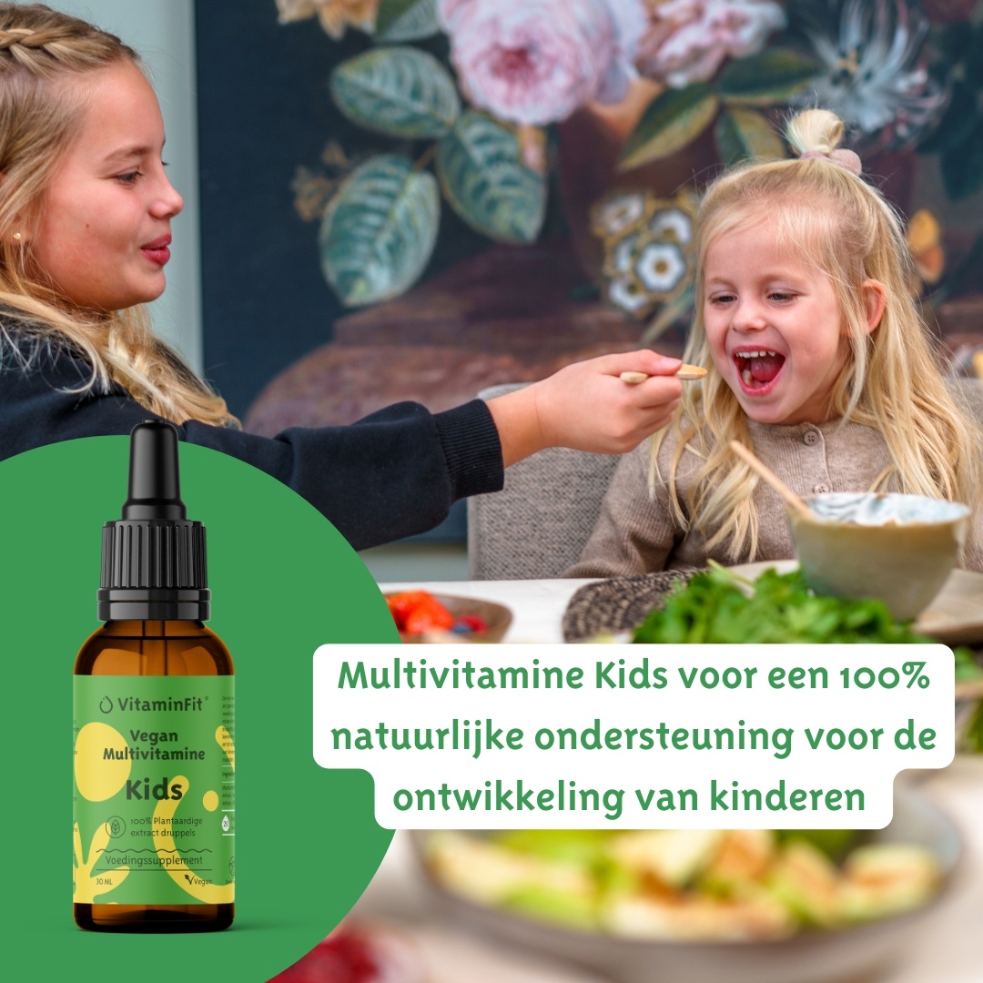 VitaminFit Multivitamine druppels voor kinderen zijn een mix van natuurlijke plantenextracten, organisch gebonden vitamines en sporenelementen! Kinderen groeien hard en hebben een druk leven. Het is belangrijk dat kinderen voldoende vitamines en mineralen binnenkrijgen, omdat ons lichaam niet in staat is zelf vitamines (uitzondering vit. D) en mineralen aan te maken.